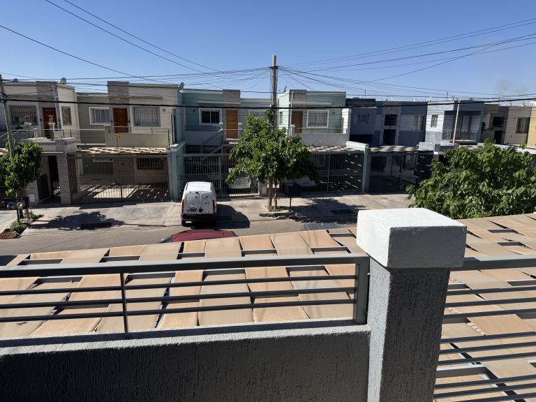 La cochera se encuentra en la planta baja, con estructura semicubierta y portón de ingreso corredizo de rejas.