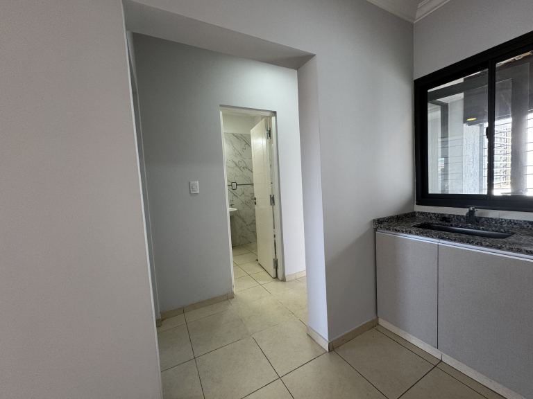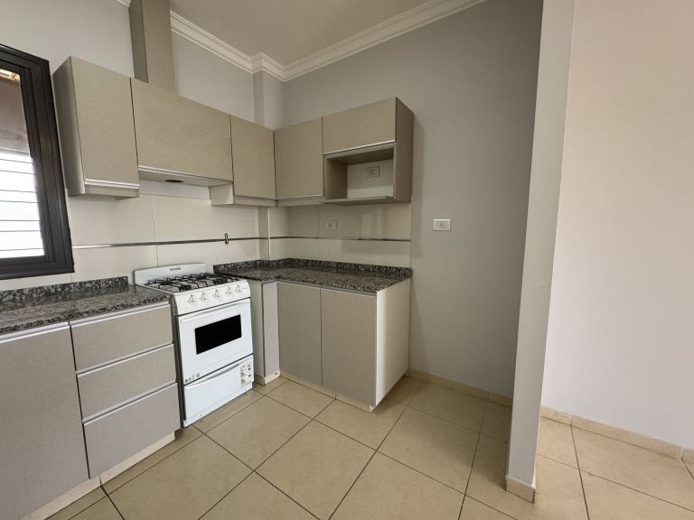 La cocina posee amoblamiento bajo mesada y alacenas, mesada de granito, pileta y grifería de primera línea. El living comedor se integra a la cocina conformado una ambiente de grandes dimensiones y con excelente ventilación cruzada gracias a sus tres ventanas estratégicamente ubicadas.