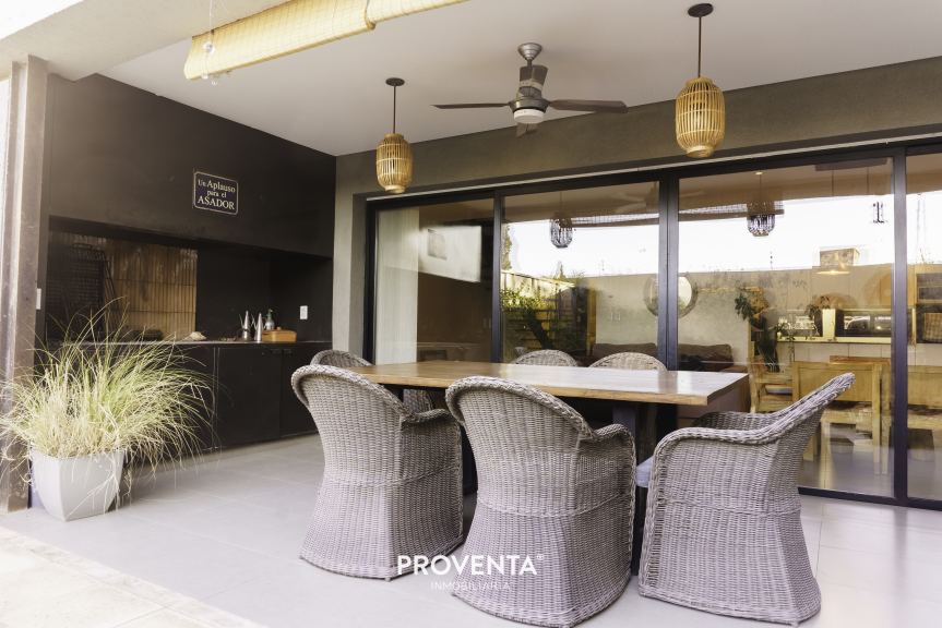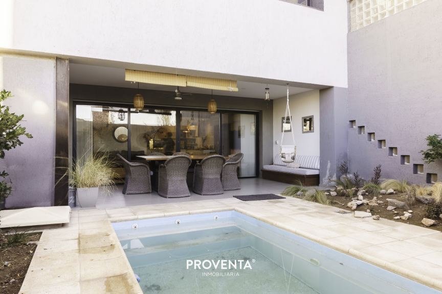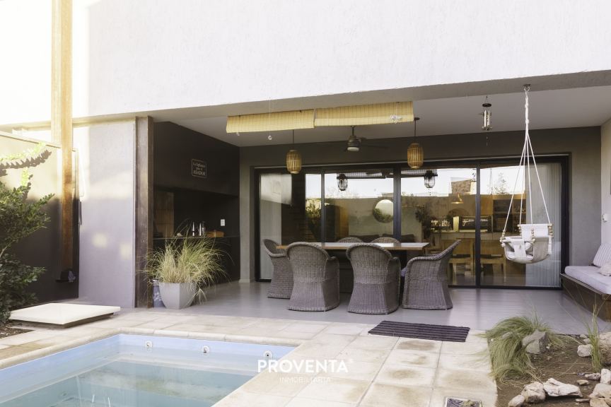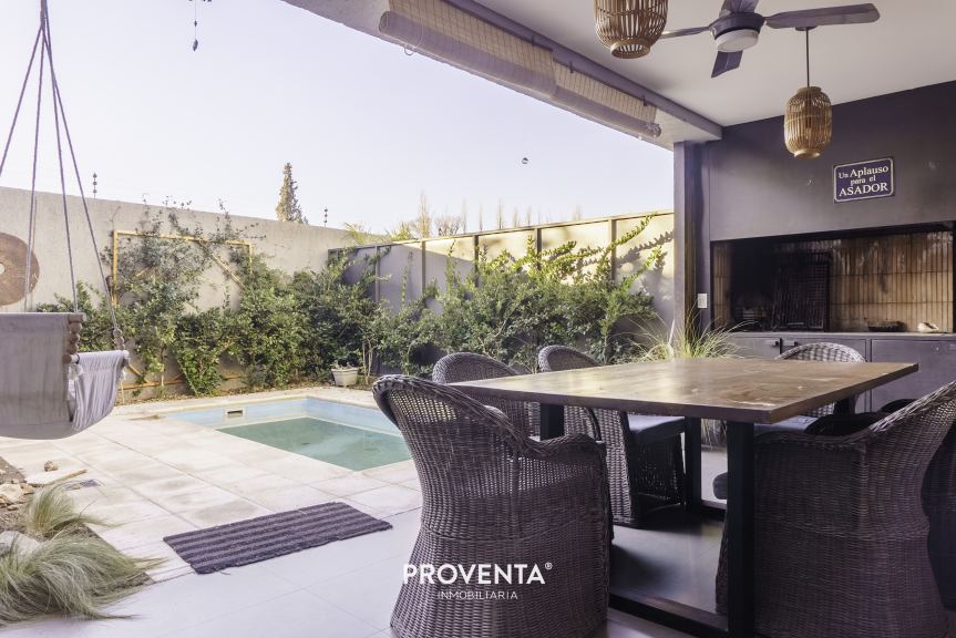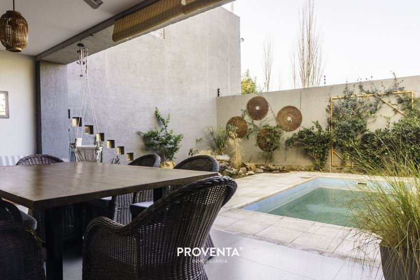 La galería cubierta incluye una parrilla espaciosa, ideal para reuniones familiares y encuentros con amigos, y se conecta con un hermoso patio con plantas autóctonas y decorativas. Una pequeña piscina equipada con sistema de bombeo y limpieza invita a disfrutar los días de verano.
