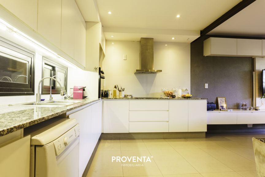 La cocina está equipada con anafe y horno empotrado, muebles bajo mesada y alacenas de diseño moderno, y grifería de primera línea.