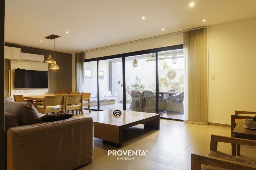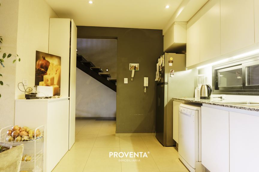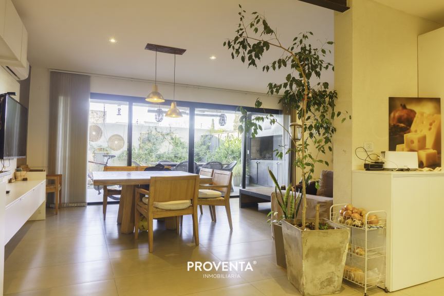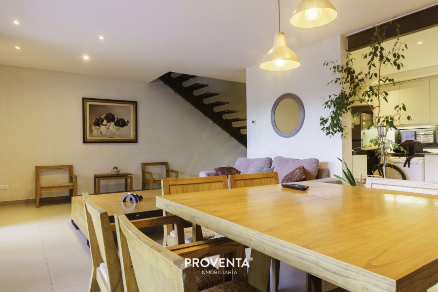 En planta baja ofrece un hall de ingreso elegante con escalera moderna, un baño de visitas cuidadosamente diseñado y un amplio living comedor con cocina semi integrada. Los ambientes son amplios, funcionales y muy cómodos, con grandes ventanales de aluminio de última generación y doble vidrio hermético, que otorgan luz natural y aislamiento térmico. Además, posee calefacción por losa radiante con caldera a gas, garantizando máximo confort en invierno.