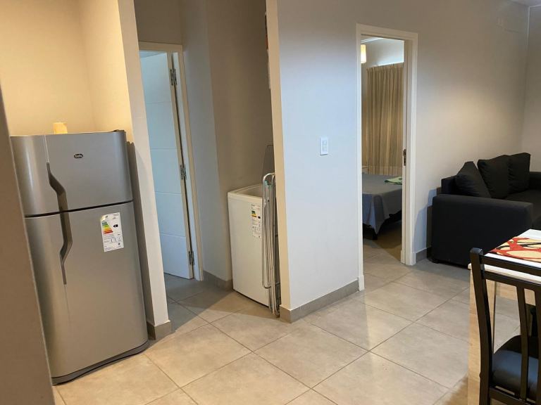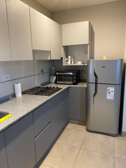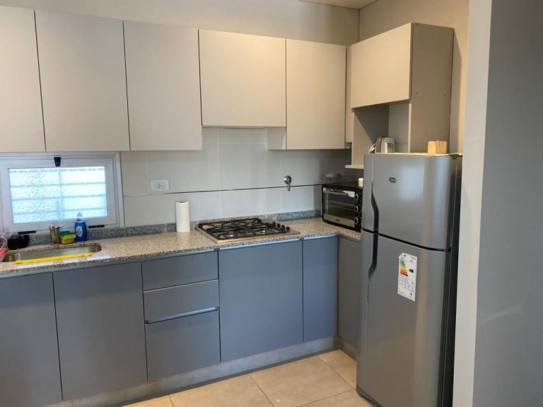 Cocina con heladera, horno eléctrico , anafe empotrado a gas y lavarropas. El amoblamiento de cocina moderno de mdf melamínico con bajo mesada y alacenas. Mesada de granito, pileta de acero y gritería.