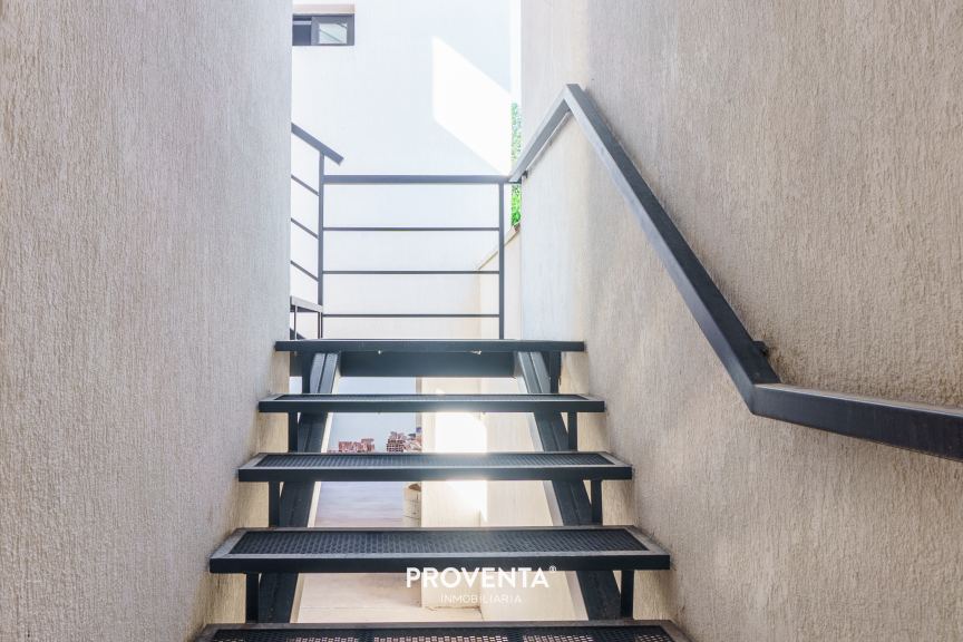 Ascensor y escalera semicubierta, integrados a un diseño moderno y luminoso.