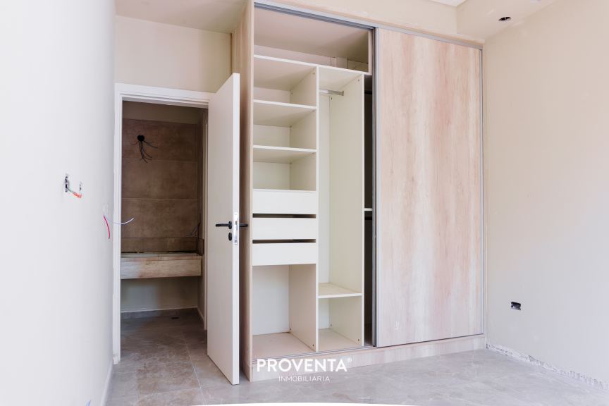 Dormitorio amplio con placard, baño completo con antebaño y espacioso estar-comedor con cocina integrada.